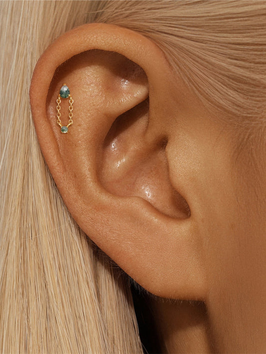 925 Natural Moss Agate Double Chain Drop Flat Back Stud