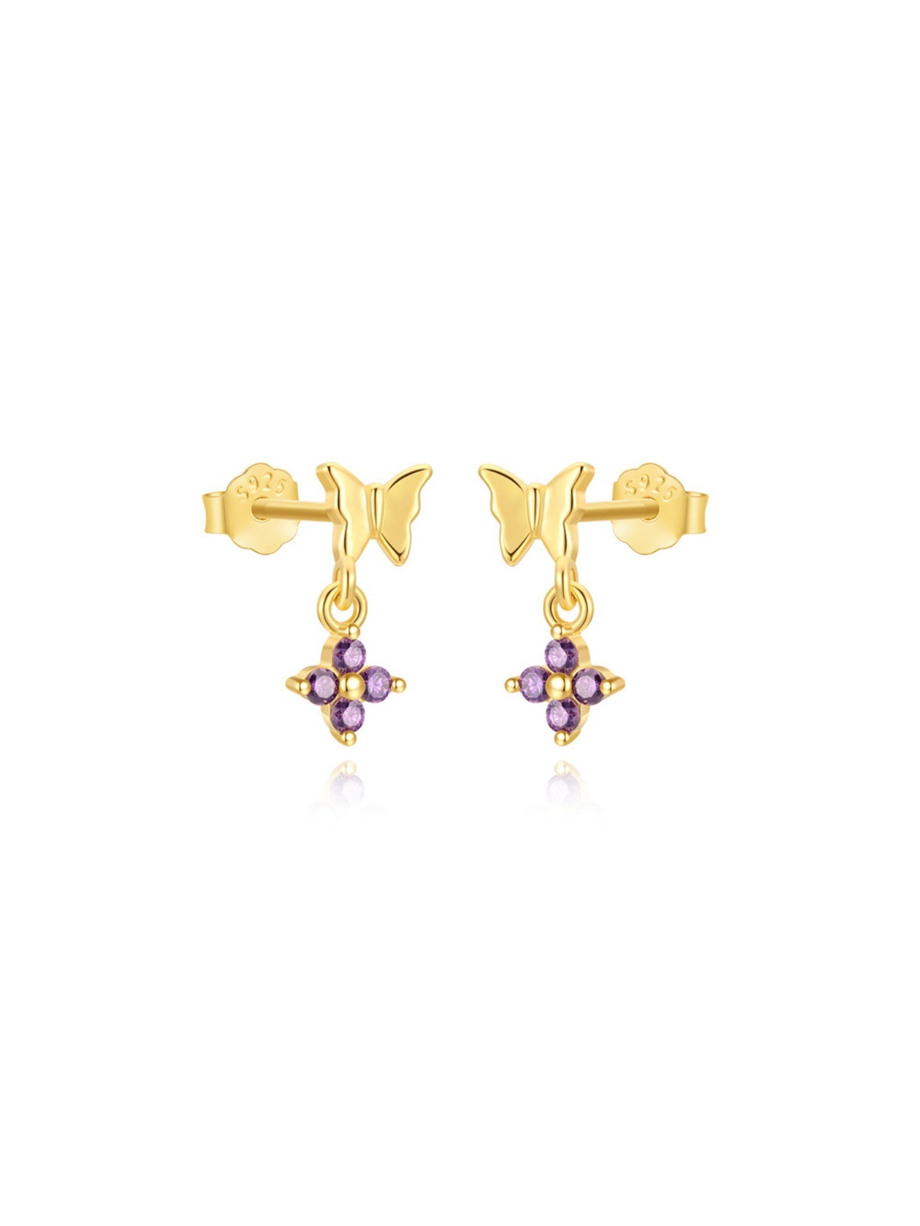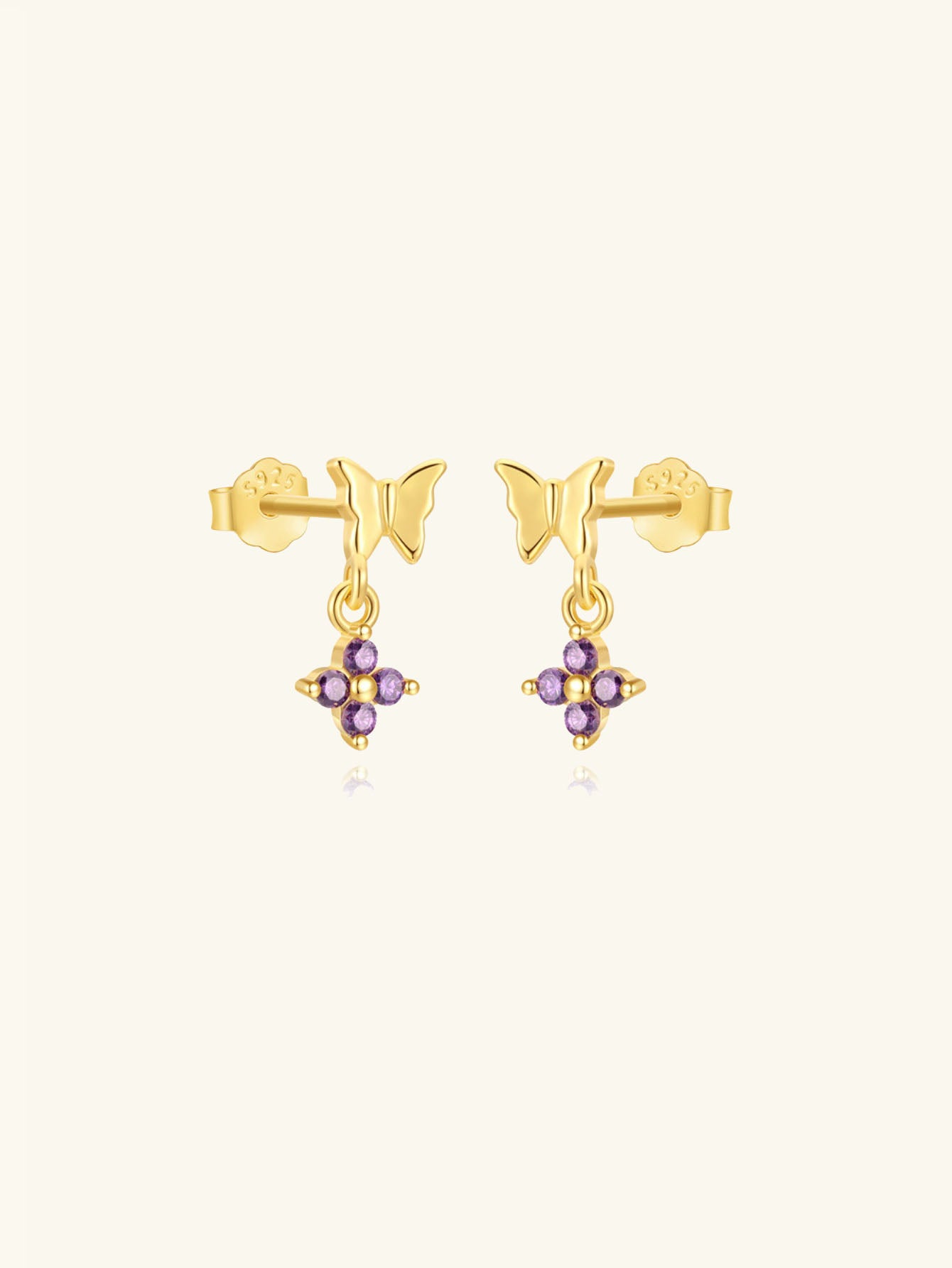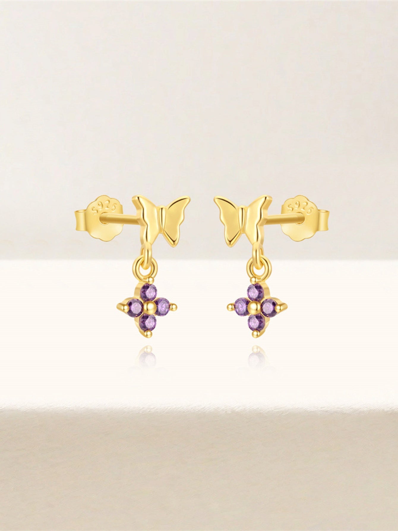 925 Sterling Silver Butterfly & Purple Flower Drop Earrings