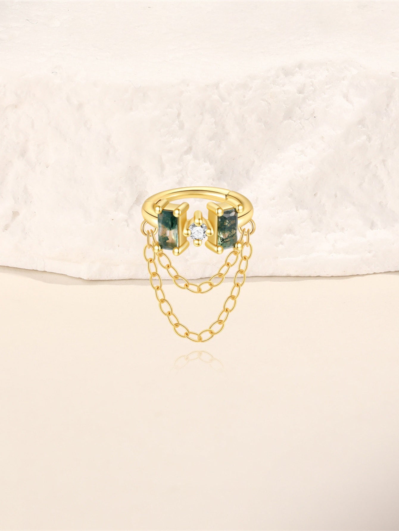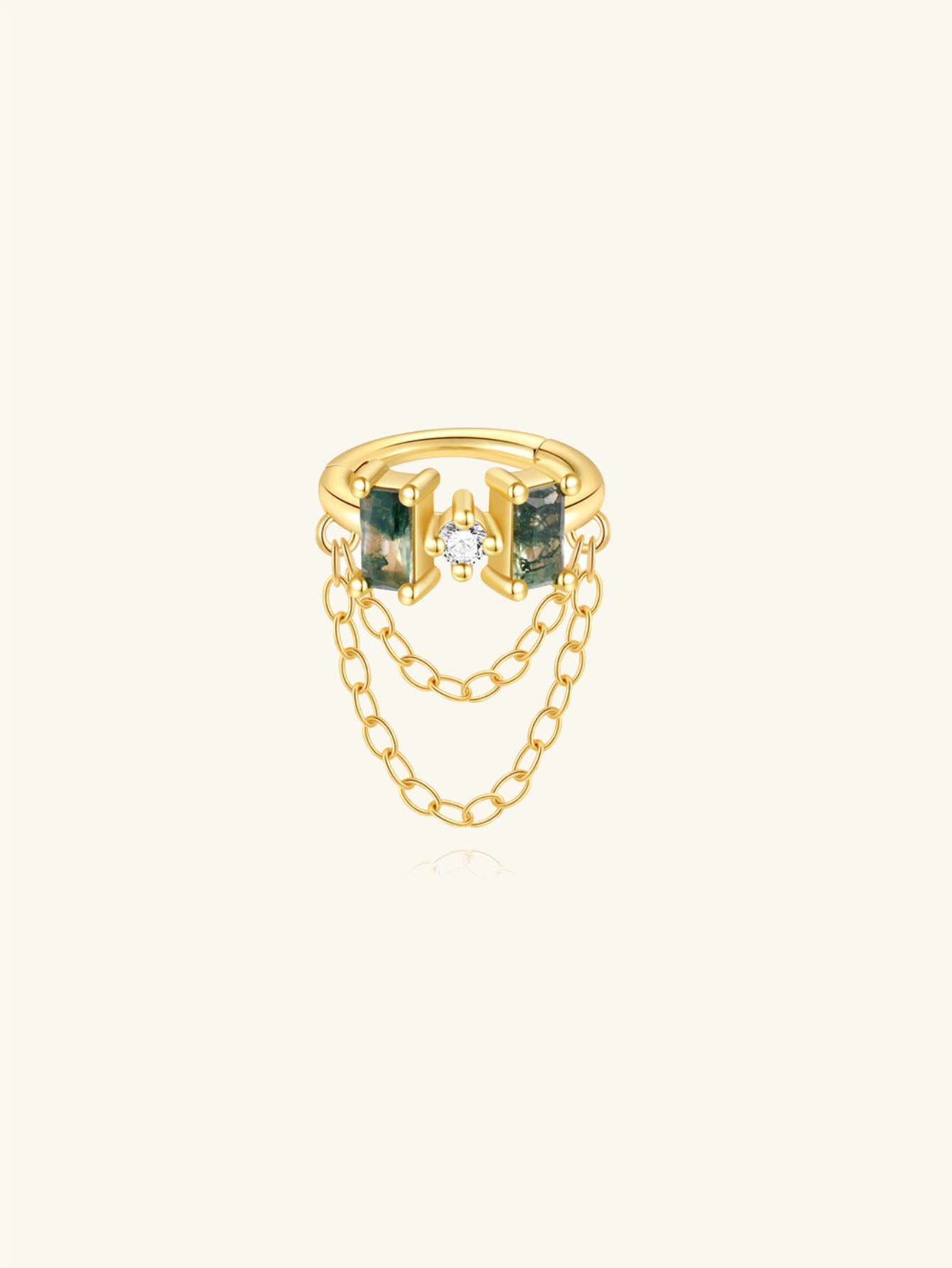 925 Sterling Silver Moss Agate Baguette Double Chain Huggie Hoop