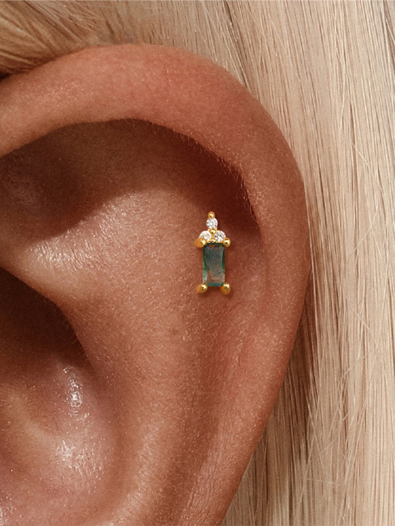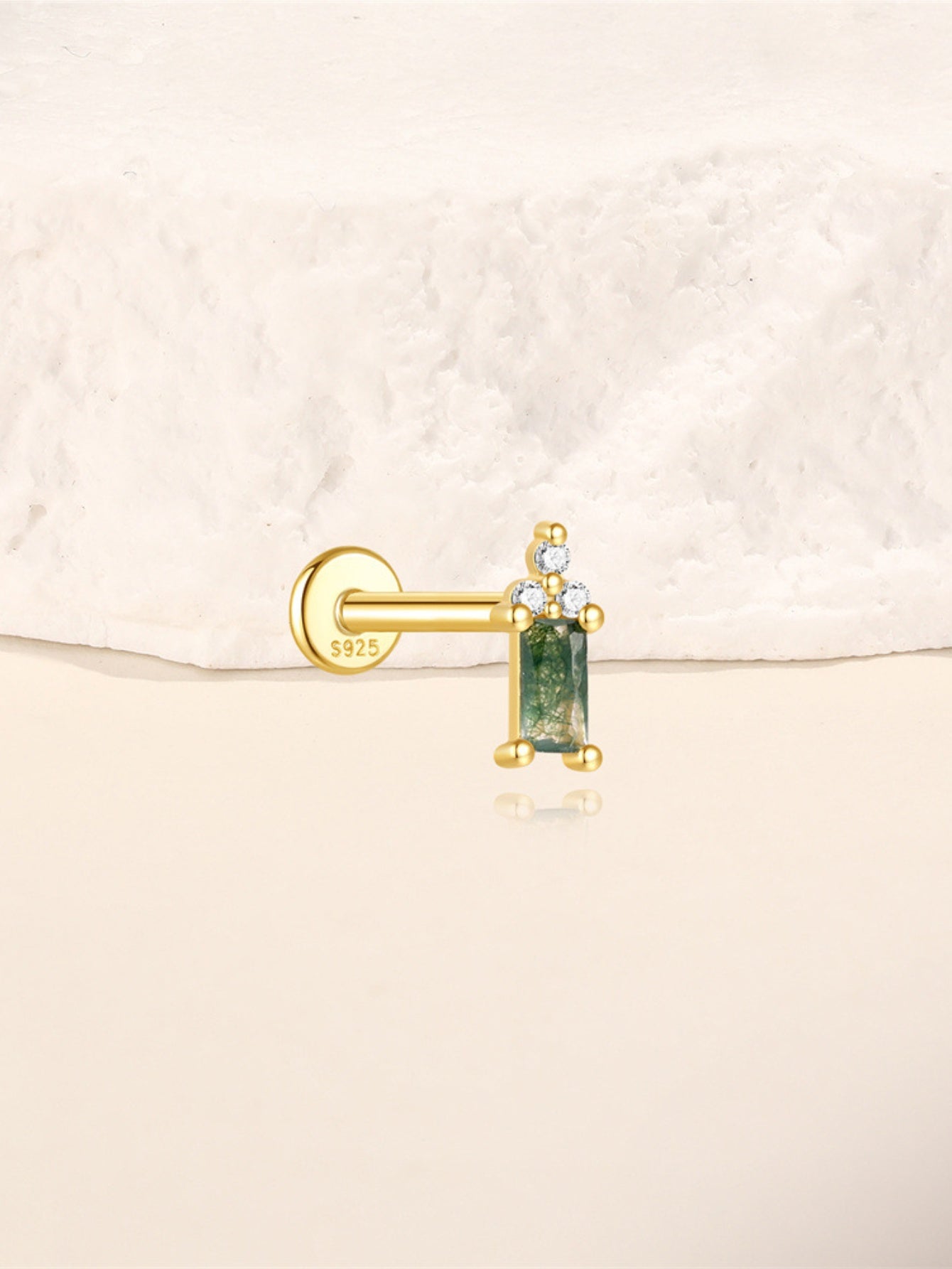 925 Sterling Silver Moss Agate Baguette Flatback Stud