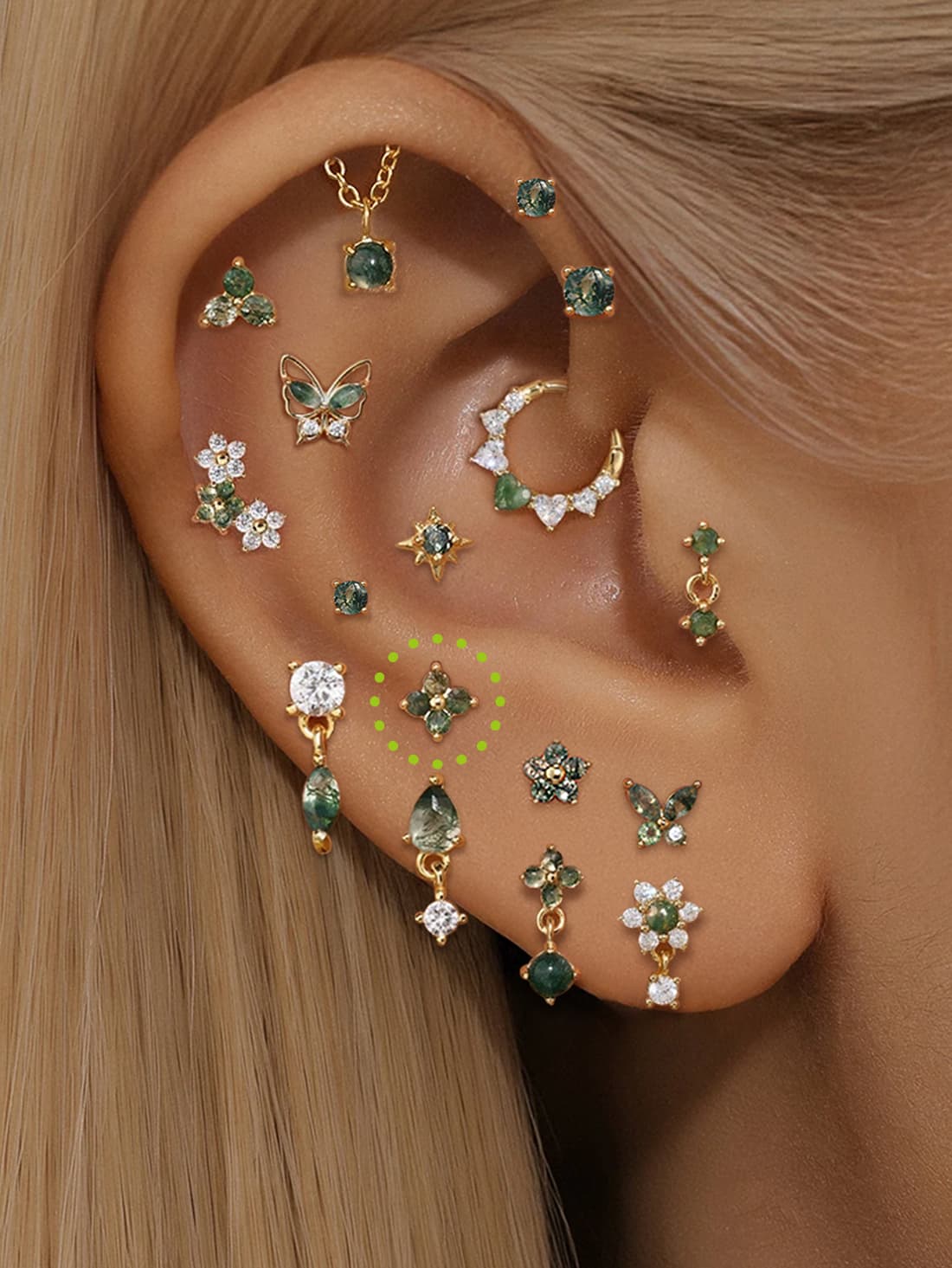 S925 Moss Agate Four-leaf clover Flatback Piercing Stud