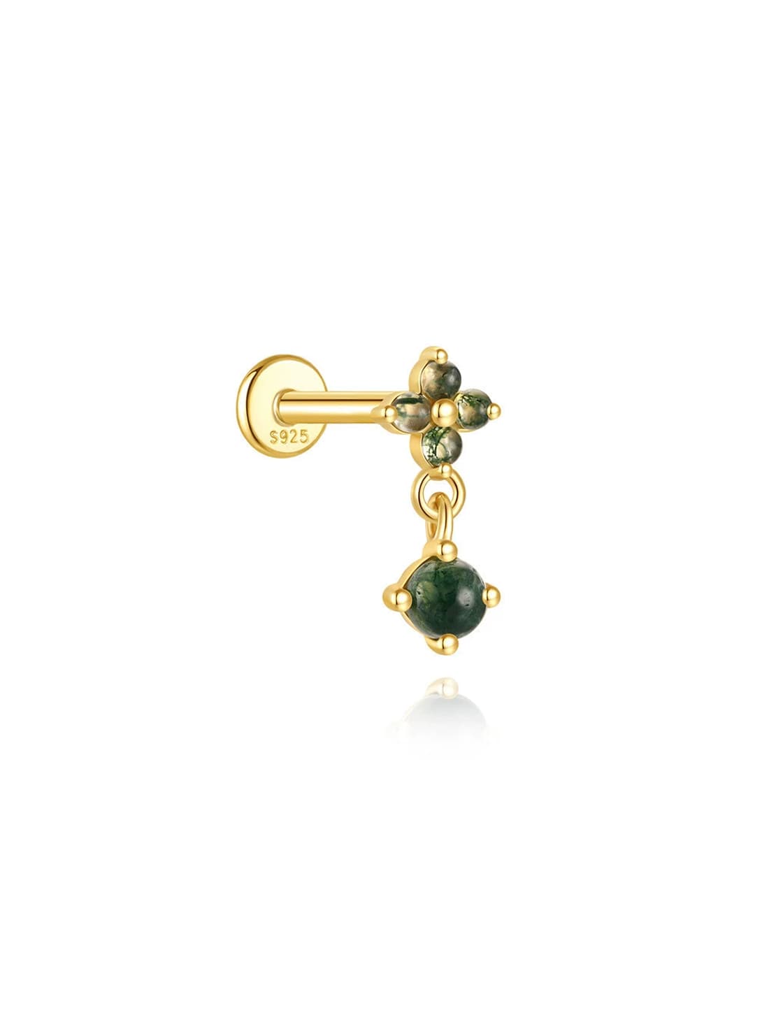 S925 Moss Agate Four-Leaf Clover Round Pendant Flatback Piercing Stud